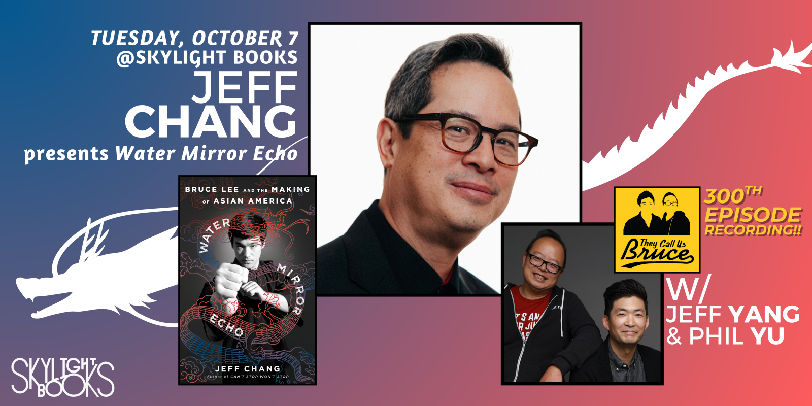 Come celebrate the release of Water Mirror Echo and the 300th episode of They Call Us Bruce podcast in this special taping with Jeff Yang and Phil Yu!